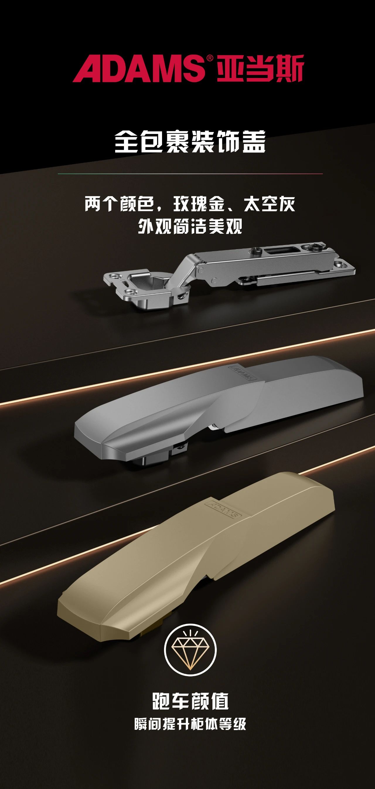 每款跑車鉸鏈都搭配全包裹裝飾蓋,裝飾蓋板隨著鉸鏈的運(yùn)行而同步滑動(dòng),并將鉸鏈主體機(jī)構(gòu)隱藏于其中。跑車鉸鏈顏色分為:玫瑰金和太空灰,讓鉸鏈融入到家居設(shè)計(jì)中,為您的櫥柜一角增添質(zhì)感,滿足個(gè)性化的追求與需求。