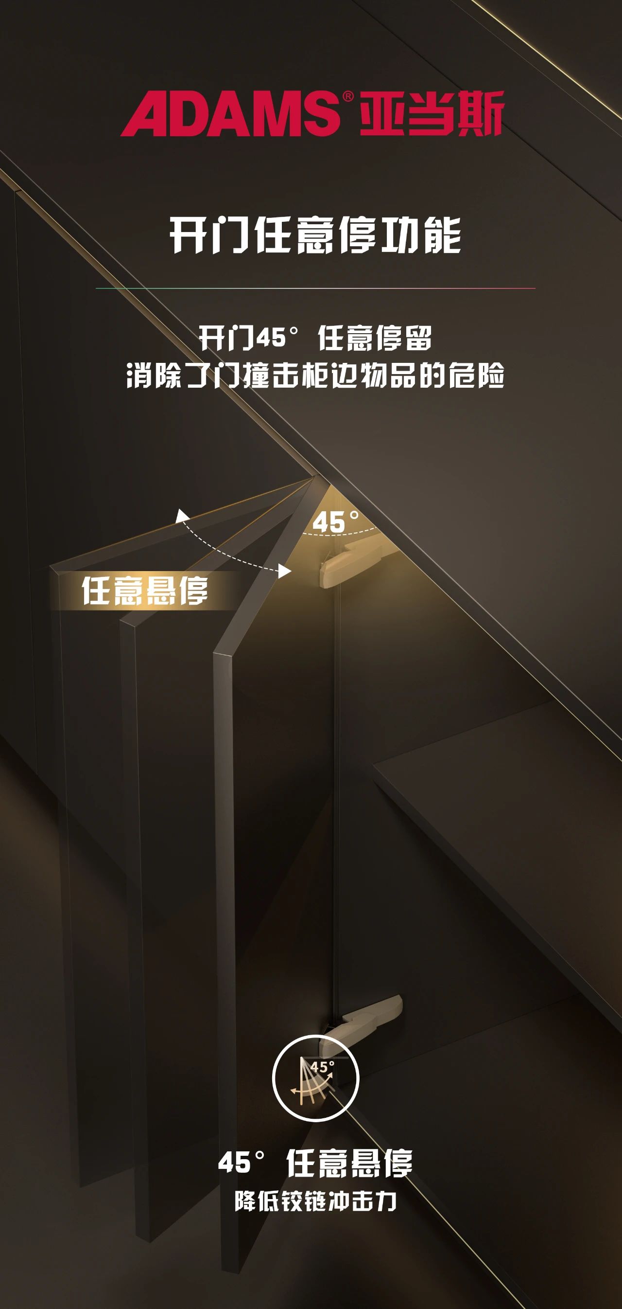 跑車鉸鏈含有兩段力功能,可實(shí)現(xiàn)打開角度大于45°后,柜門能在45°~105°之間任意位置停下,消除以往緩沖鉸鏈開門即到最大開門角度的缺陷,消除門撞擊柜邊物品的危險(xiǎn)。