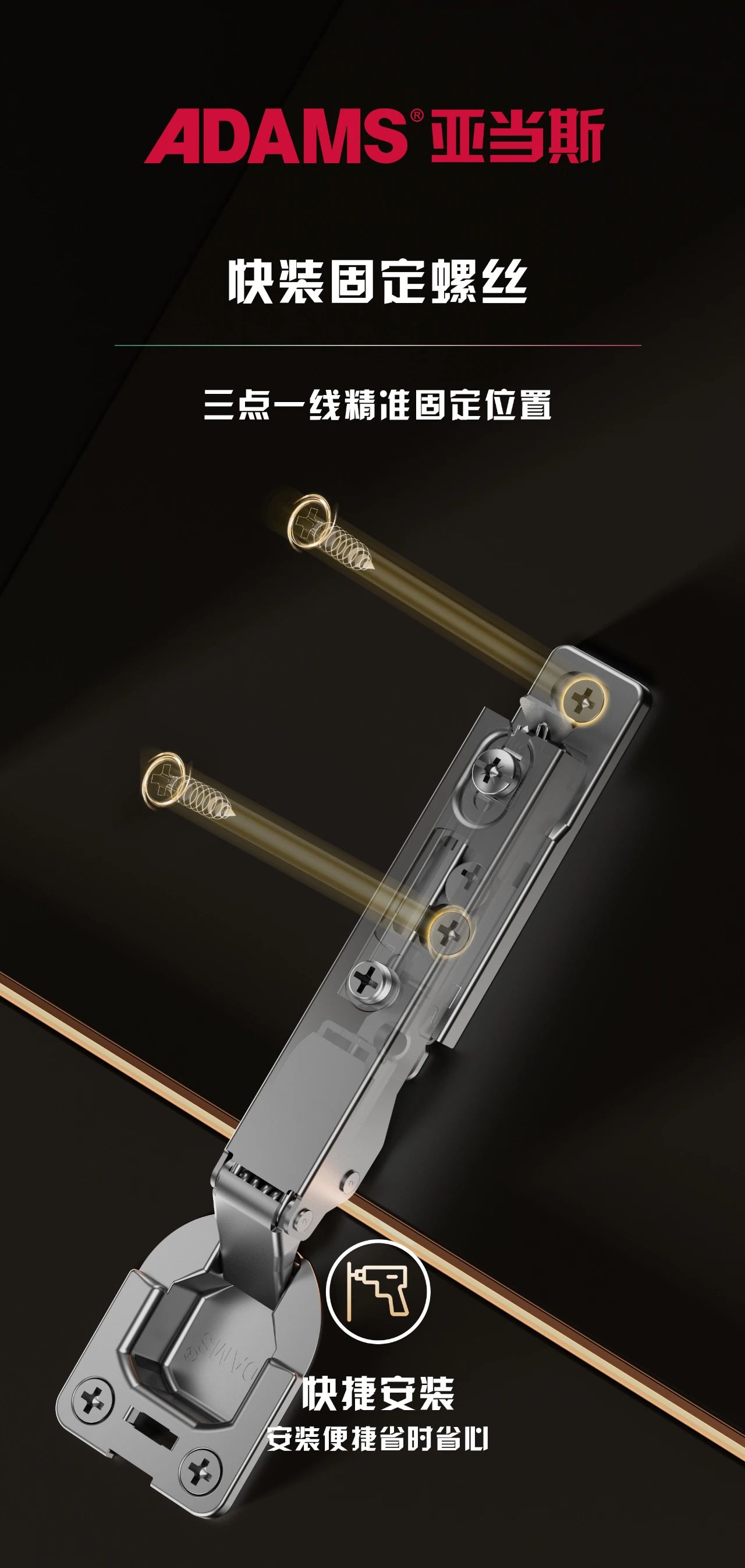 跑車鉸鏈在安裝時(shí),無(wú)需在柜門側(cè)板預(yù)打底孔,把已裝好鉸鏈的門板對(duì)齊柜體側(cè)板,直接打上預(yù)裝的螺絲及在底座尾部打上的螺絲就能安裝完畢。