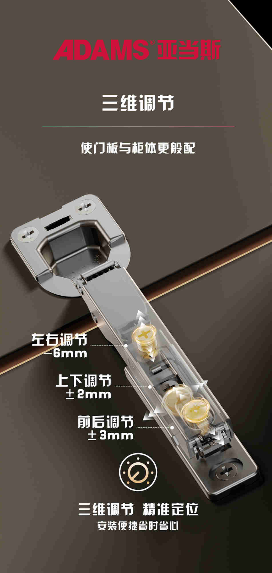 柜門調(diào)節(jié)很靈活,只需要擰動(dòng)螺絲就能調(diào)節(jié)柜門間的縫隙,安裝調(diào)節(jié)易如反掌,省時(shí)省力。