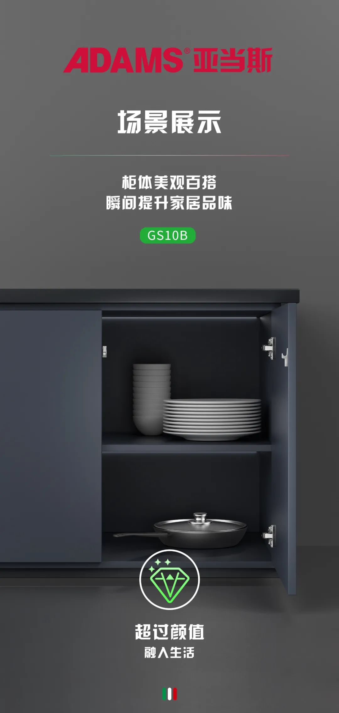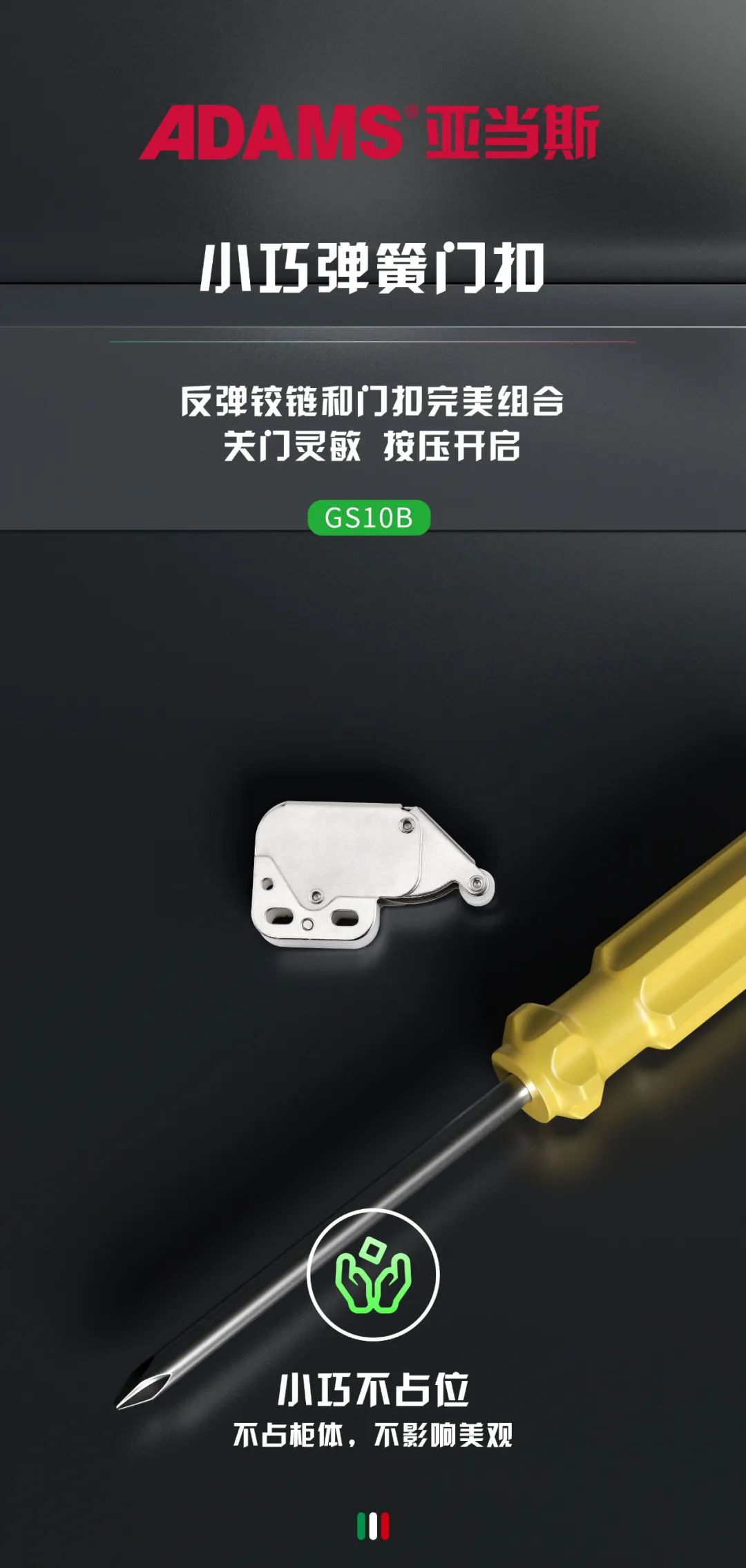 這對組合應用于無拉手柜門的設計,亞當斯GS10B反彈鉸鏈配置彈簧門扣,只需輕輕按壓柜門,門板即可自動大角度開啟,解決以往柜門不能達到全彈開的缺點,還需用手把柜門掰開的弊端。關門時,推門至關閉位,反彈器與門扣自鎖。