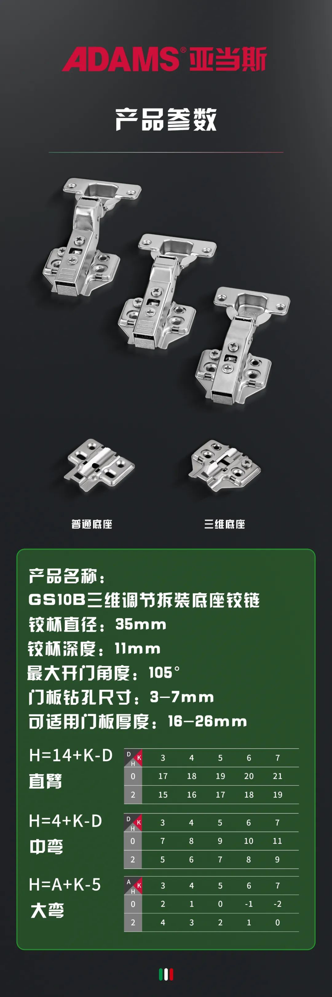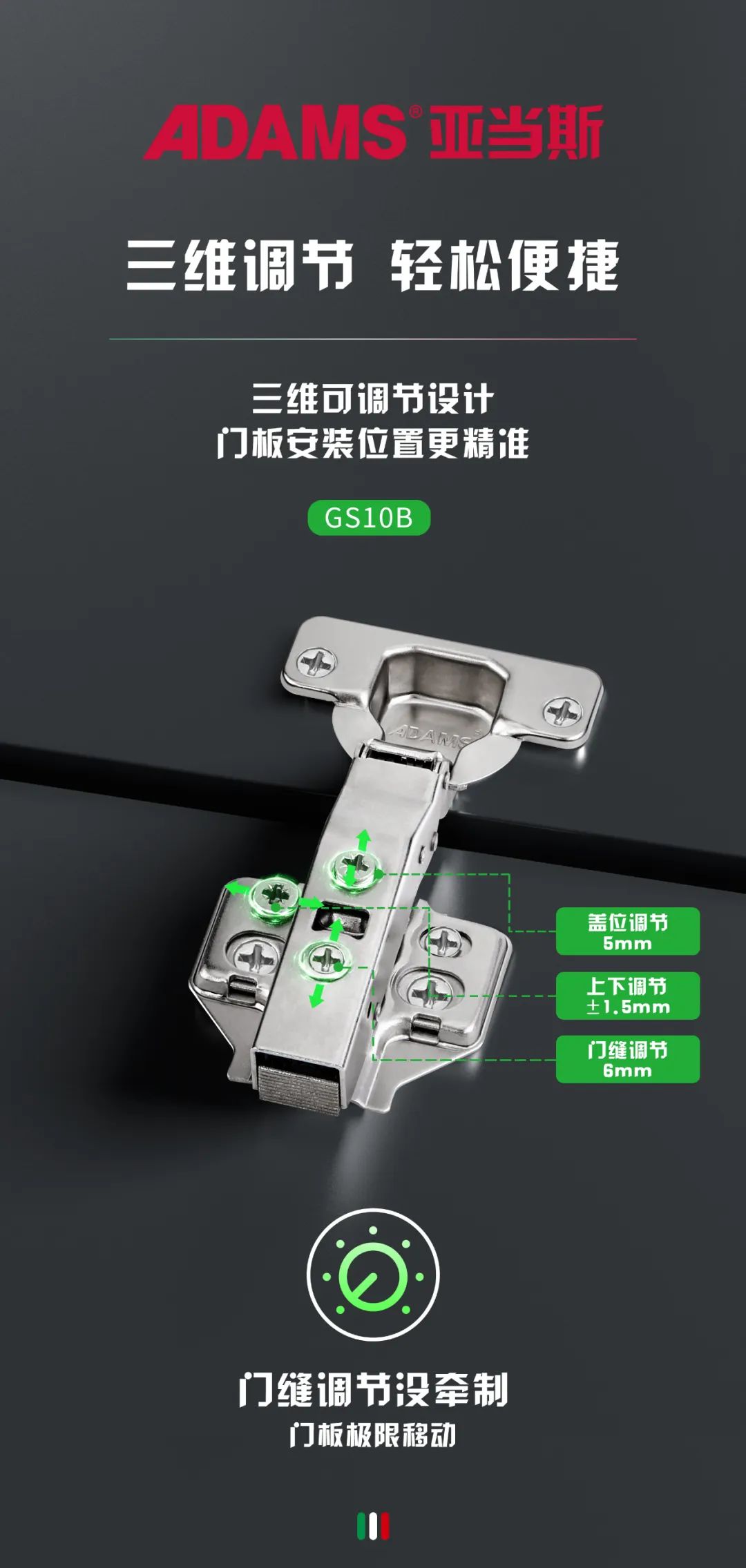 GS10B反彈鉸鏈三維可調節設計,調節范圍大、門板安裝位置精準到位,極大提高鉸鏈的安裝效率和質量,密封性更強。