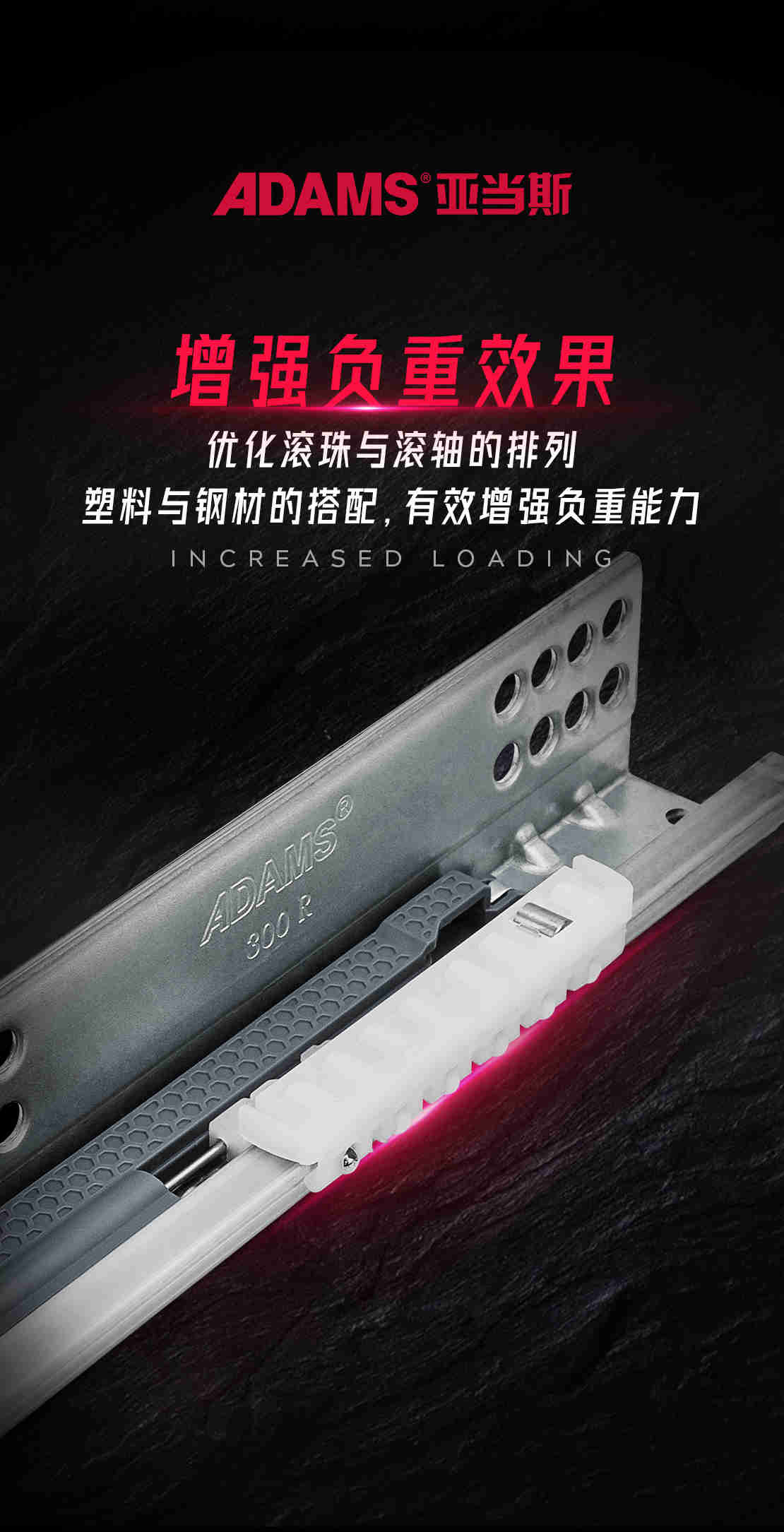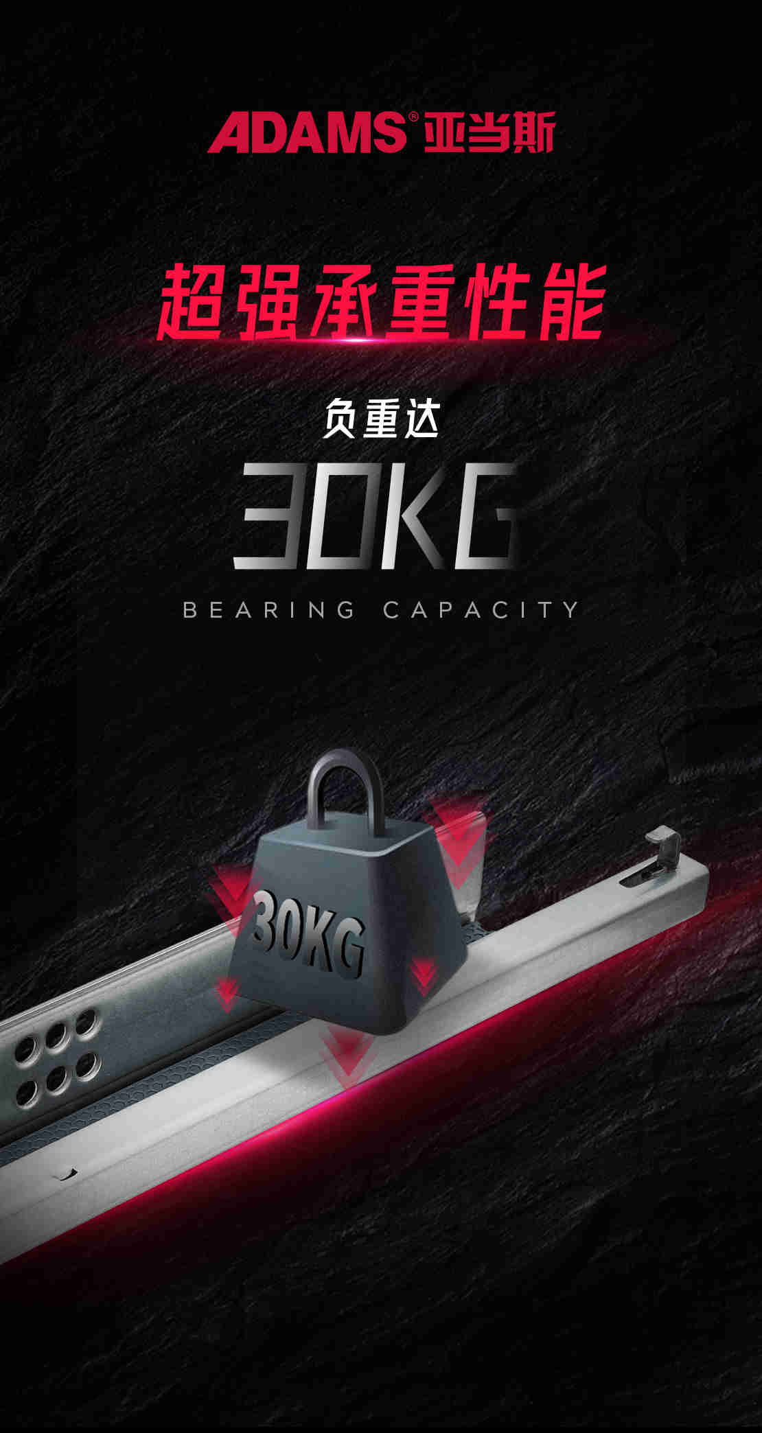 新一代二節(jié)隱藏滑軌承重達(dá)30KG,負(fù)重運(yùn)動(dòng),依然開合輕松不阻滯,一推一拉之間,絲滑順暢,經(jīng)久耐用。