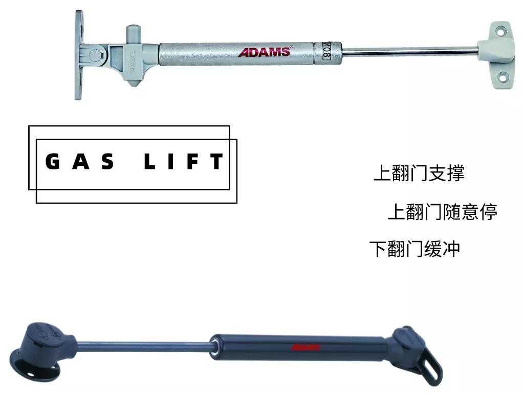 亞當斯氣動支撐桿可選功能:上翻門支撐、上翻門隨意停、下翻門緩沖。消費者可根據櫥柜設計和實際需要進行選擇。