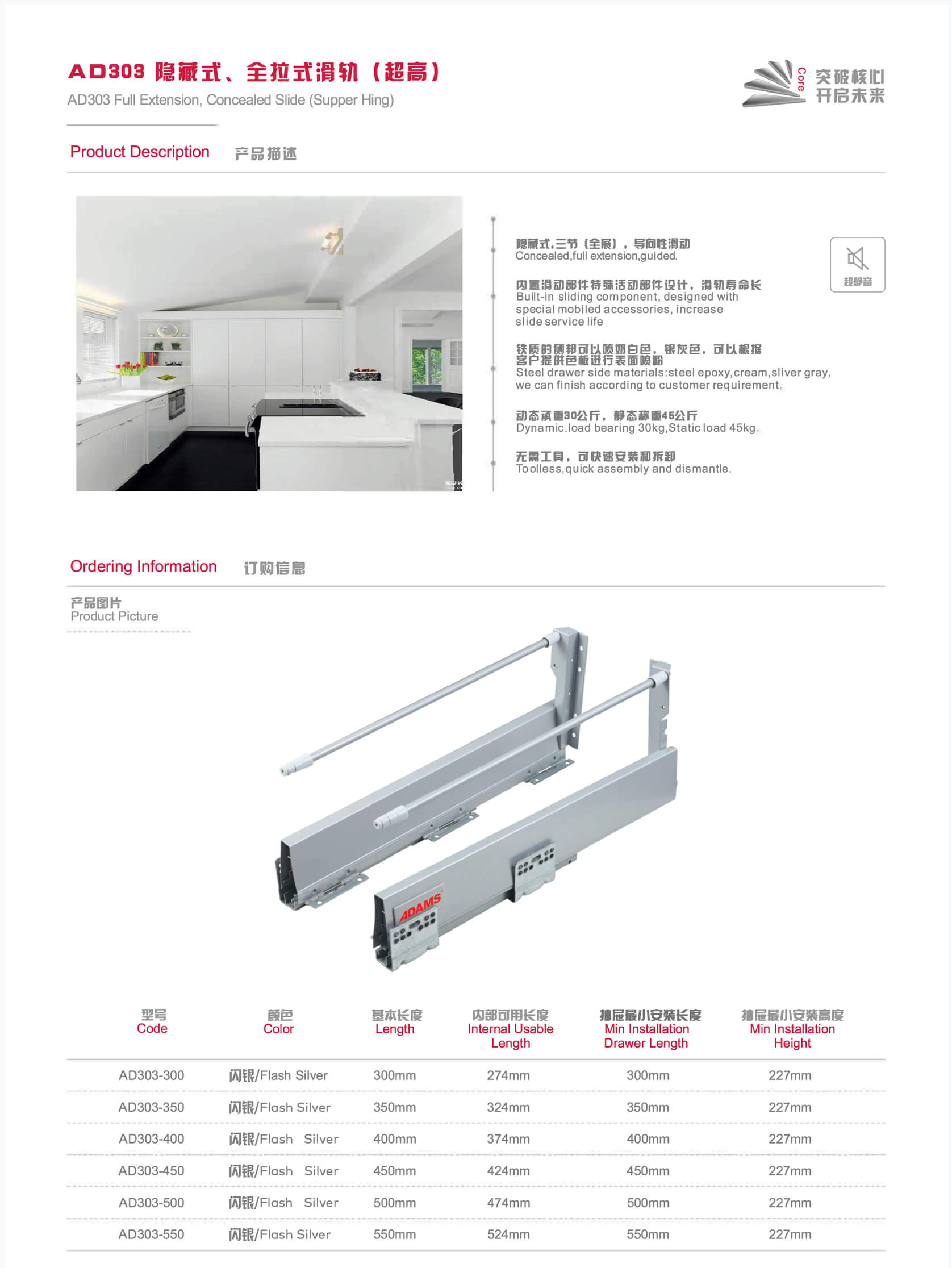 AD303隱藏式、全拉式滑軌(超高)