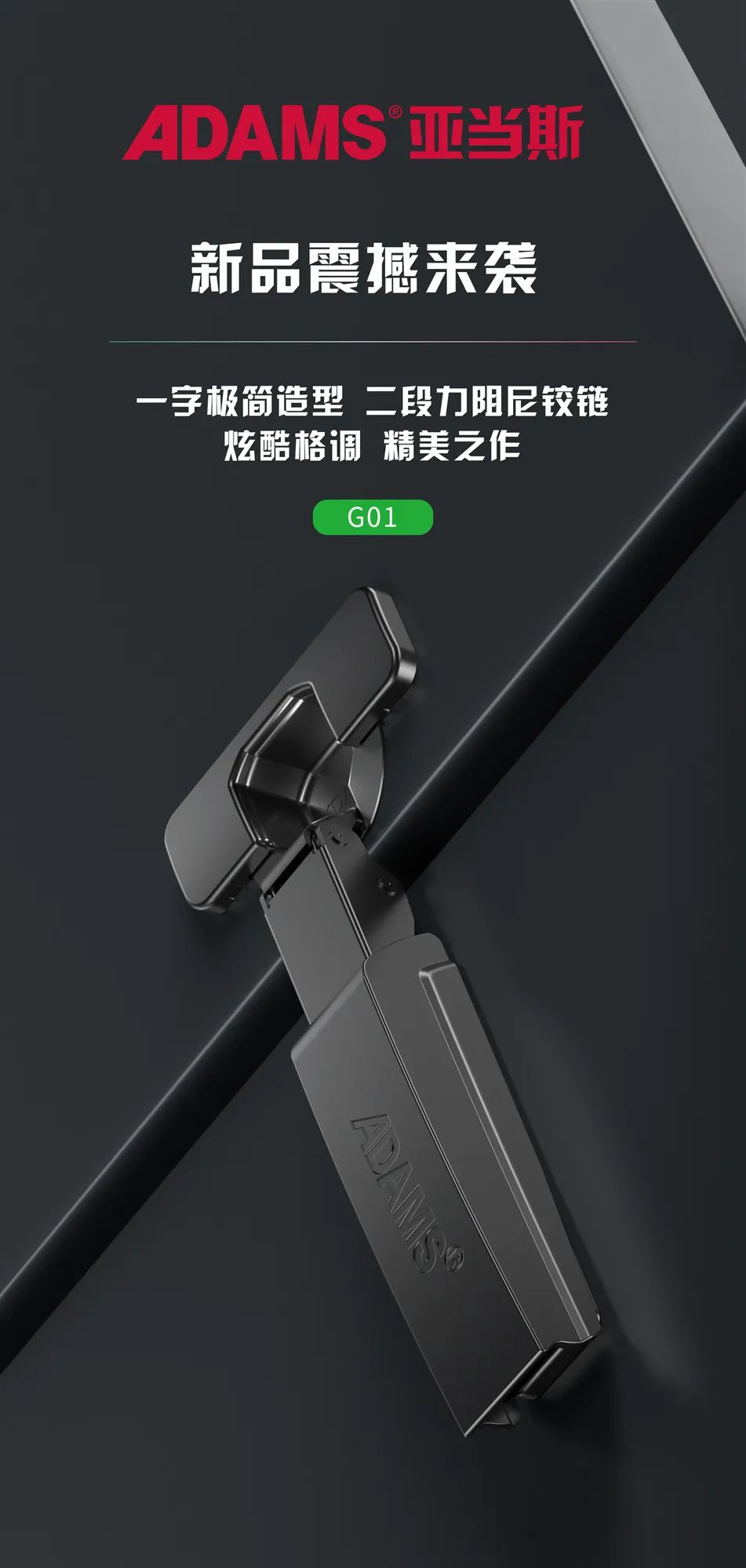 The Adams G01 series hinges, as two-stage force damping hinges, are made of high-quality cold-rolled steel and meticulously crafted through copper, nickel, and chromium four layer electroplating technology. They have strong anti-corrosion and rust resistance, and are not afraid of the test of time. During installation, its excellent hole free installation performance is fully utilized, without the need for pre embedded holes and marking, and without the need to separate the invisible letter base and main body. Simply fix the hinge cup on the door panel, and fix it with screws through mutual adhesion between the door panel and the side panel. The simple appearance and luxurious cabinet doors complement each other, showcasing an elegant and exquisite lifestyle attitude.