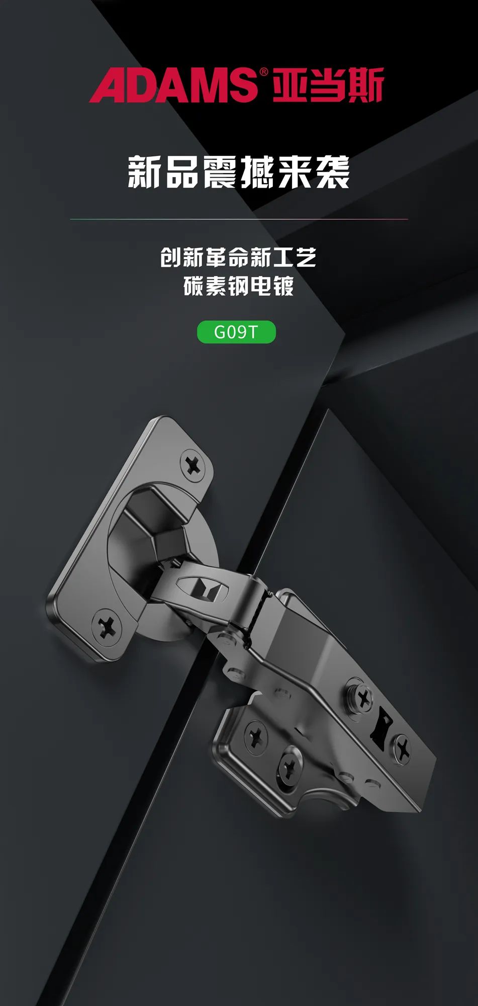 The Adams G09T series hinges use innovative revolutionary technology: carbon steel electroplating (four layer electroplating of copper, nickel, tungsten gold, and nano sealing paint). One of the representatives of high aesthetic value in hinges, the surface has undergone acid salt spray testing for 24 hours, and can withstand harsh environments. Thoughtful positioning two-stage force design, opens to 85 ° and activates the large angle buffering function. Installation is equally convenient, with no pre embedded holes for direct installation, precise alignment, time-saving and worry free.