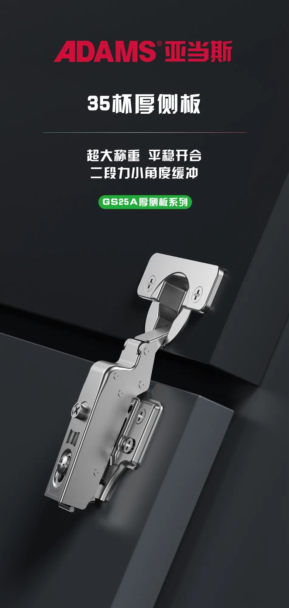 Adams GS25A thick side panel series hinges are designed specifically for thick doors. The 35mm full cover hinge can reach the number of covered doors of 40mm full cover hinge, with strong versatility. This hinge has the function of freely hovering the door and two-stage force small angle buffering, effectively reducing danger and making it safer for adults and children to use.
