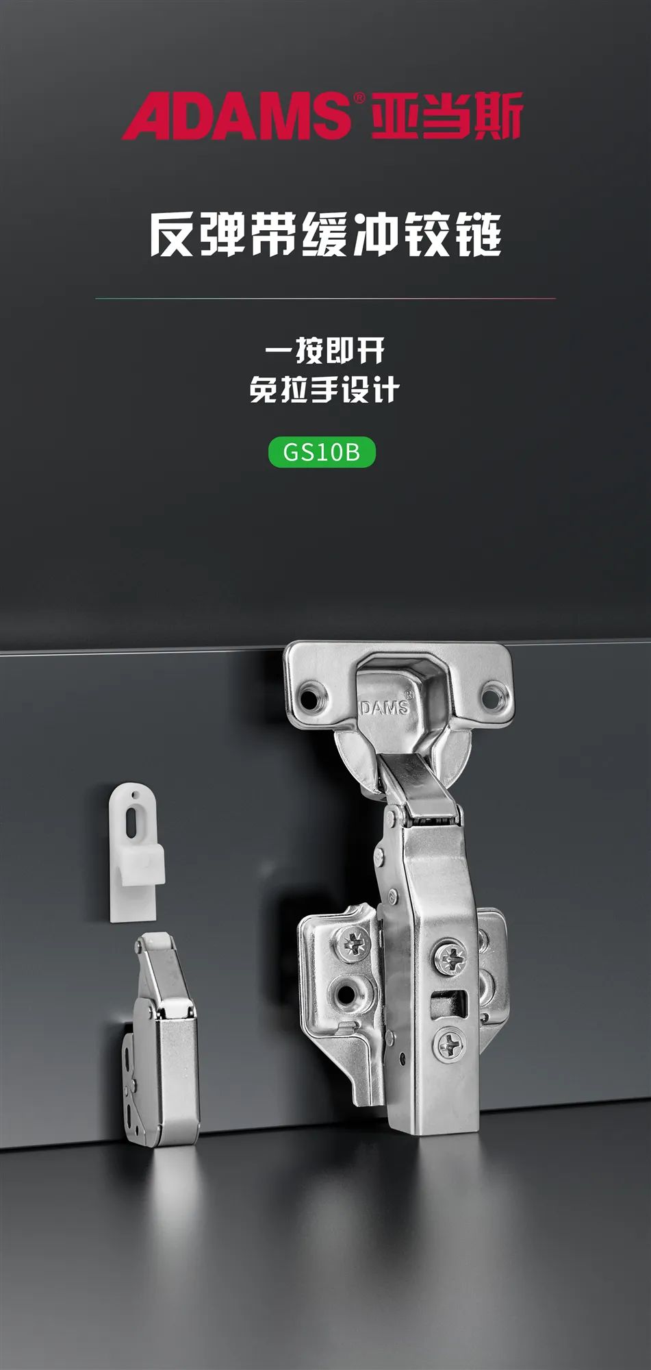 The Adams GS10B series rebound and buffering hinge is applied to cabinet doors without handles, solving the problem of not being able to fully open cabinet doors in the past. After using this hinge, gently press the cabinet door to automatically open the door panel at a large angle. The hinge is made of high-quality cold-rolled steel and stamped in one go, with a smooth surface and bright color, making it particularly suitable for minimalist style cabinets.
