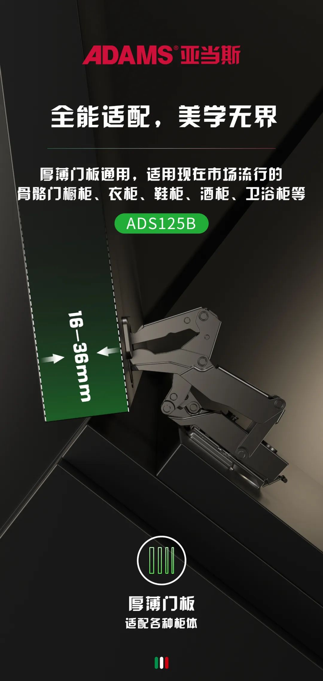 The Adams ADS125 series hinges have a wide range of applications. Installed on the Haitang corner door cabinet, it makes the cabinet edge more beautiful, the door opening angle is larger, and it is more convenient to retrieve items. The popular skeleton door cabinet can also be installed.