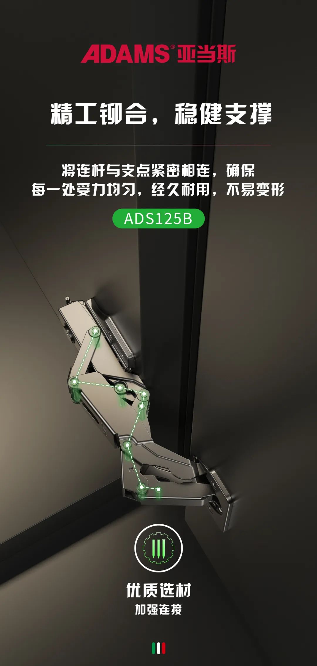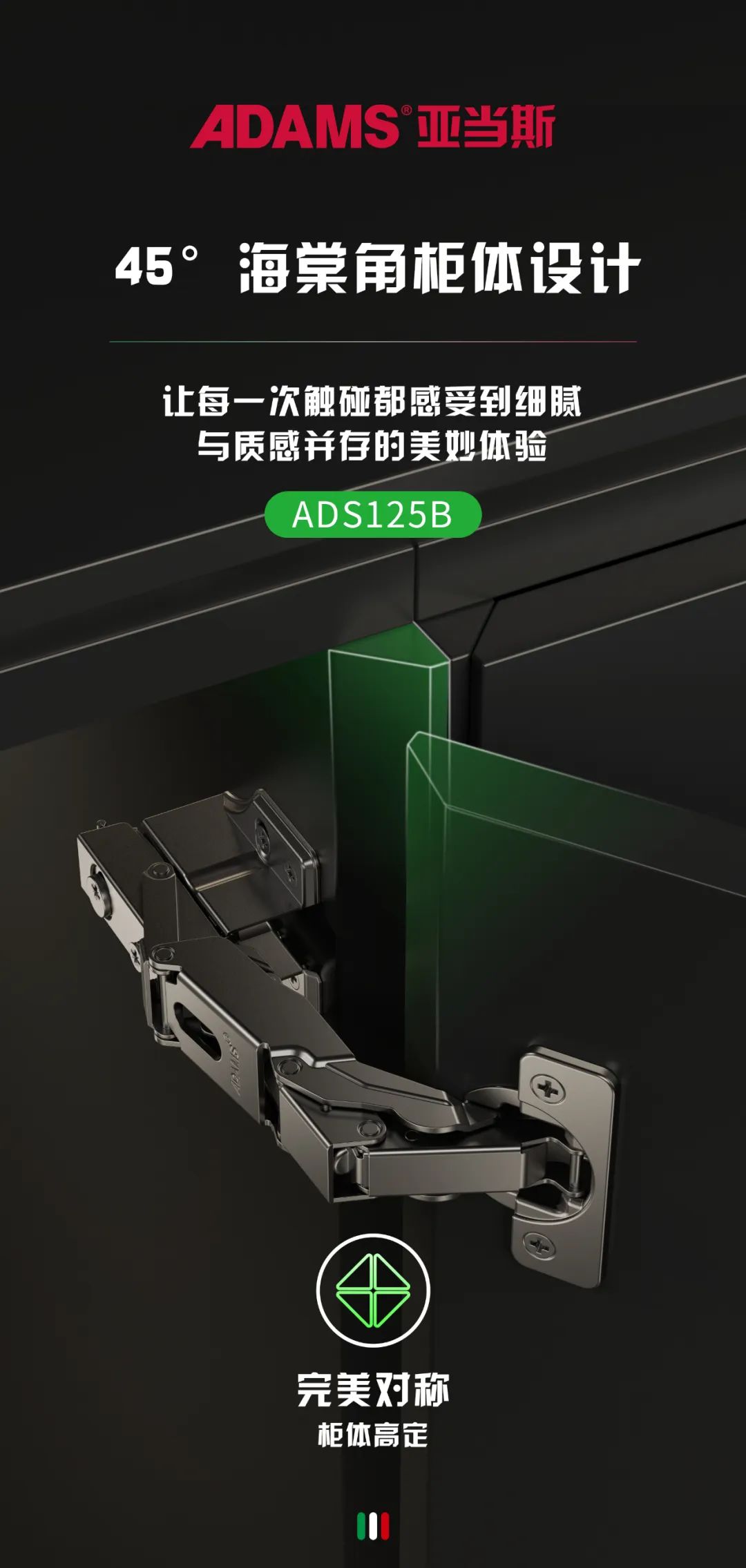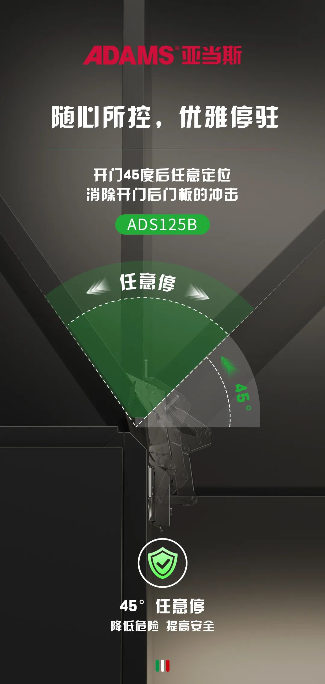 The Adams ADS125 series hinges have an arbitrary positioning function. After opening the cabinet door to 45 degrees, it can stop at any angle without the door panel forcefully hitting the wall or cabinet items, bringing a real sense of security to every household.