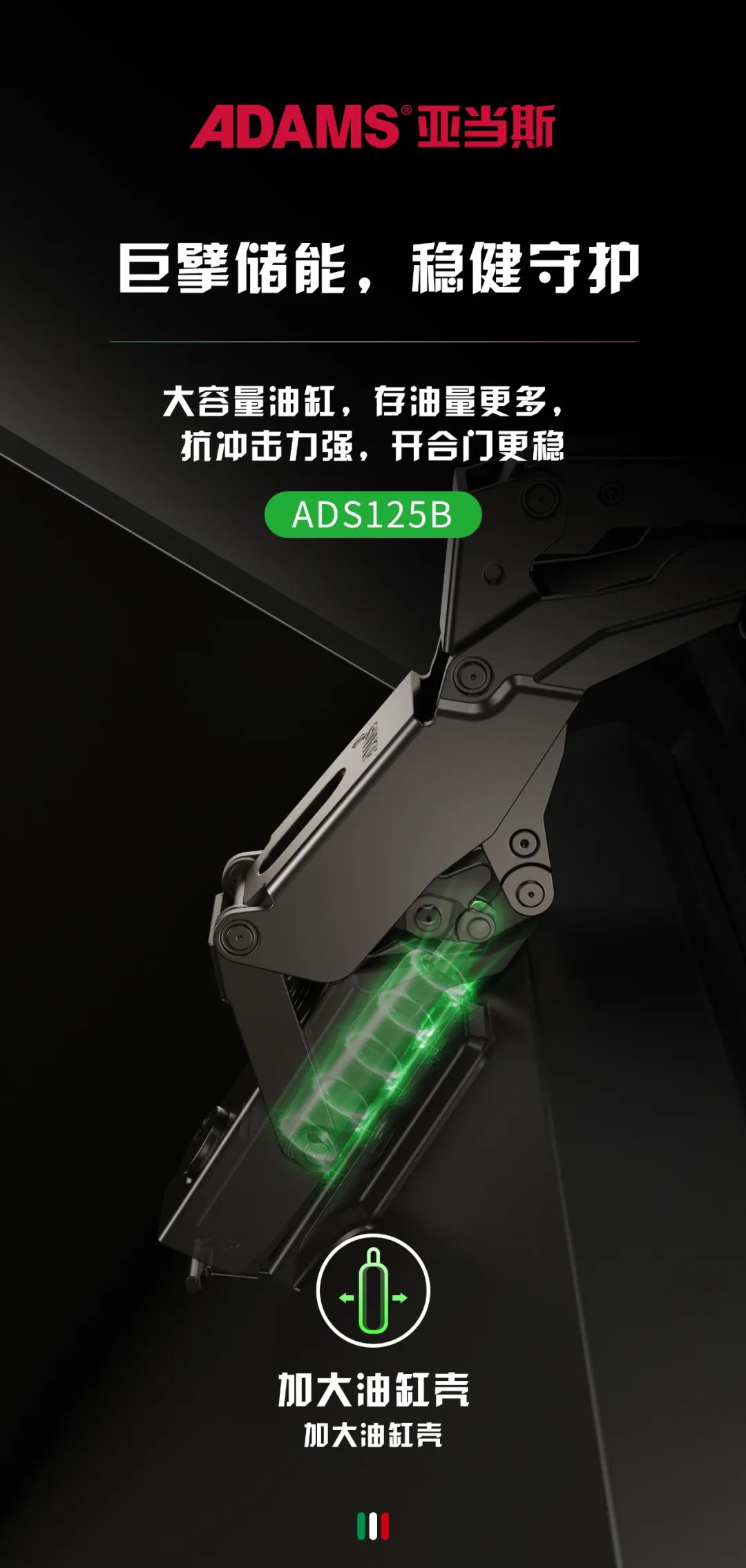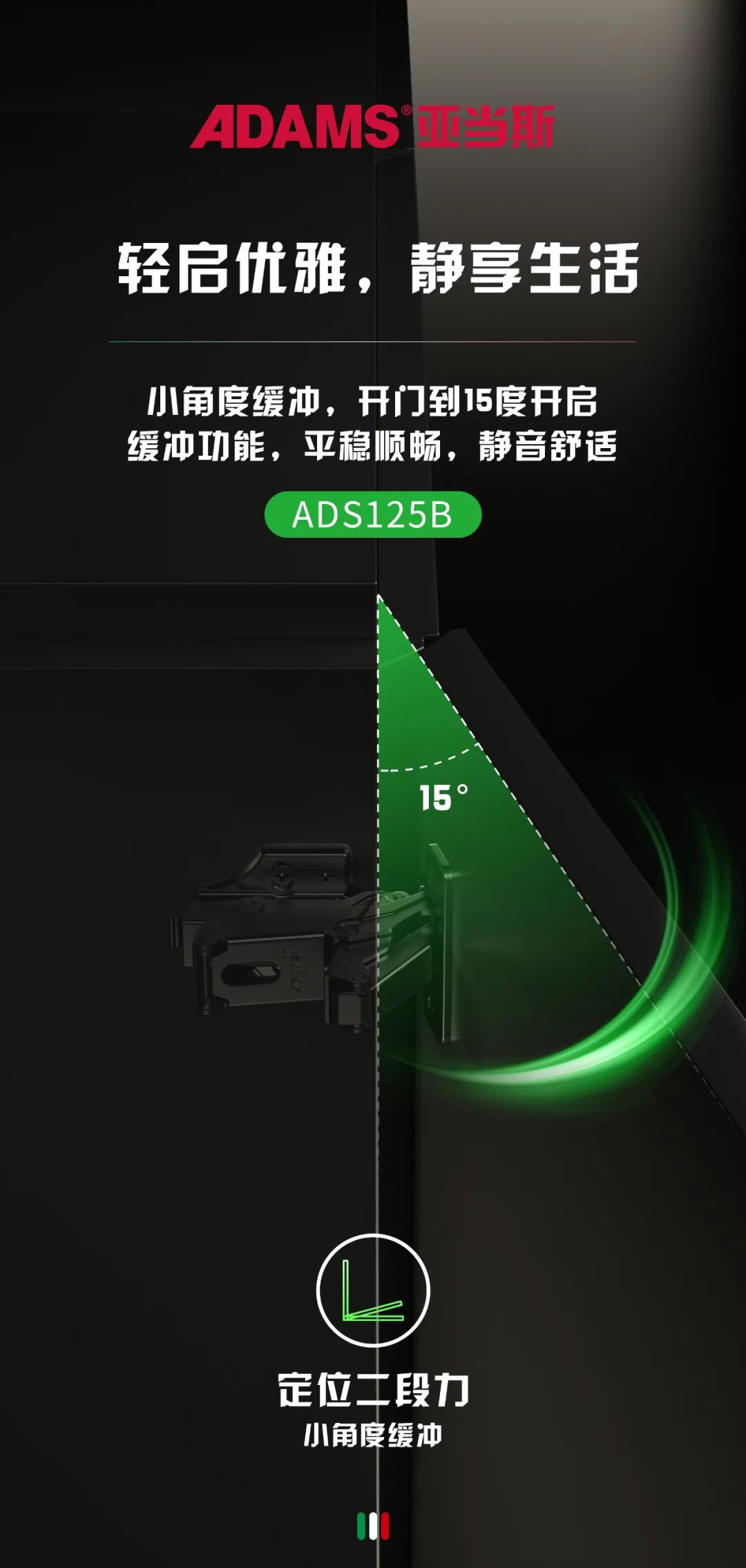The Adams ADS125 series hinges have a small angle buffering function. When the cabinet door is opened to 15 °, it can activate the secondary buffering, reducing the risk of hand gripping and minimizing the noise generated by closing the door.