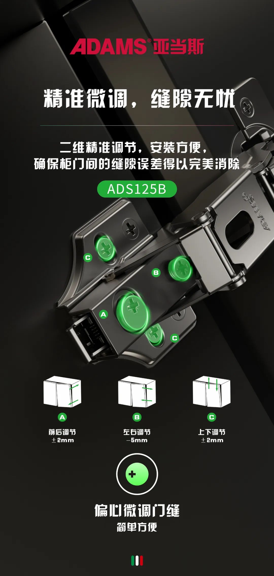 Is the cabinet door uneven when first installed? It's okay, there's no need to disassemble and reinstall. You can adjust the door seams up and down, left and right, and front and rear according to your needs. The operation is simple and even beginners can fully grasp it.