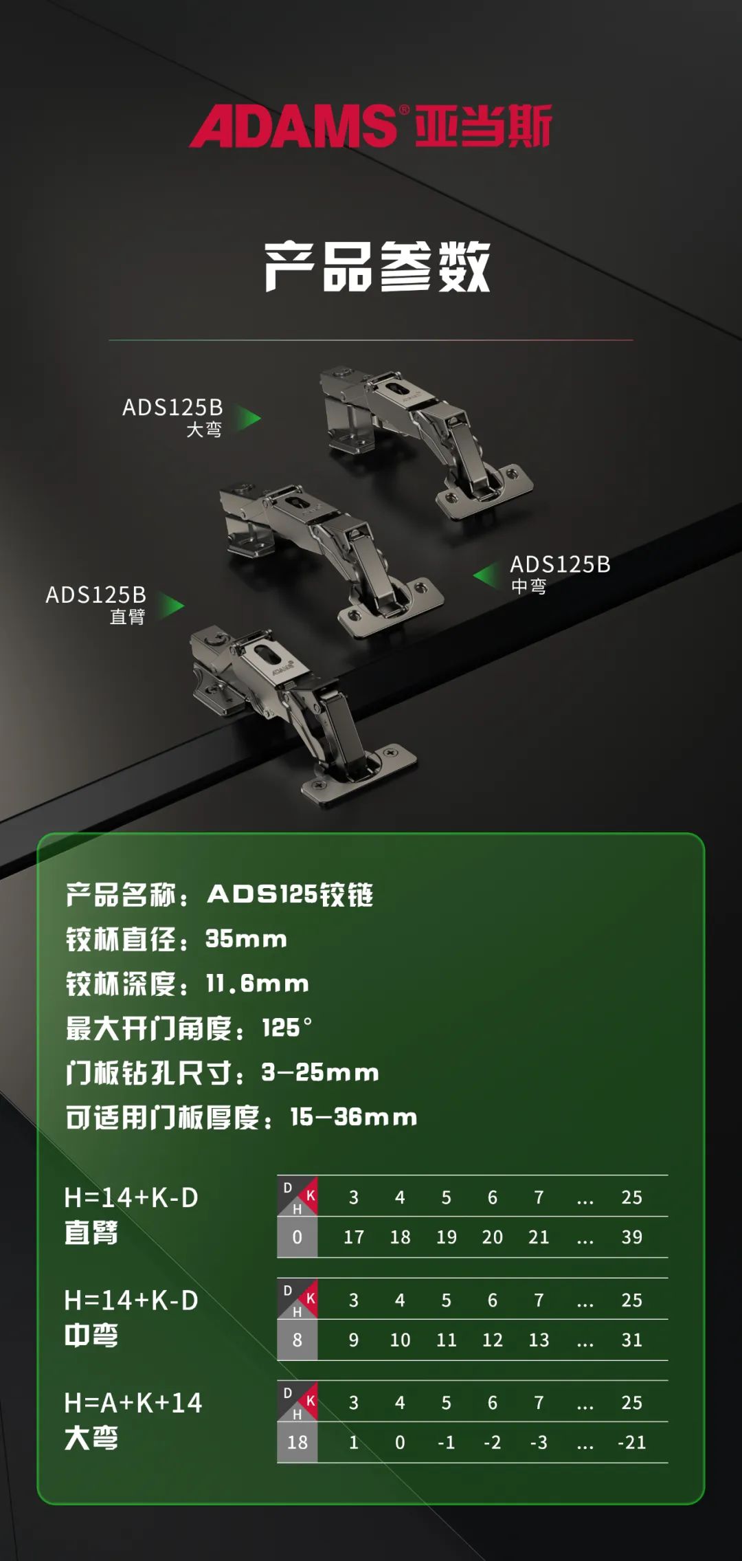 This hinge is suitable for door panel openings with a distance of 3-25mm, a thickness range of 16-36mm, and a maximum cover door of 39mm.